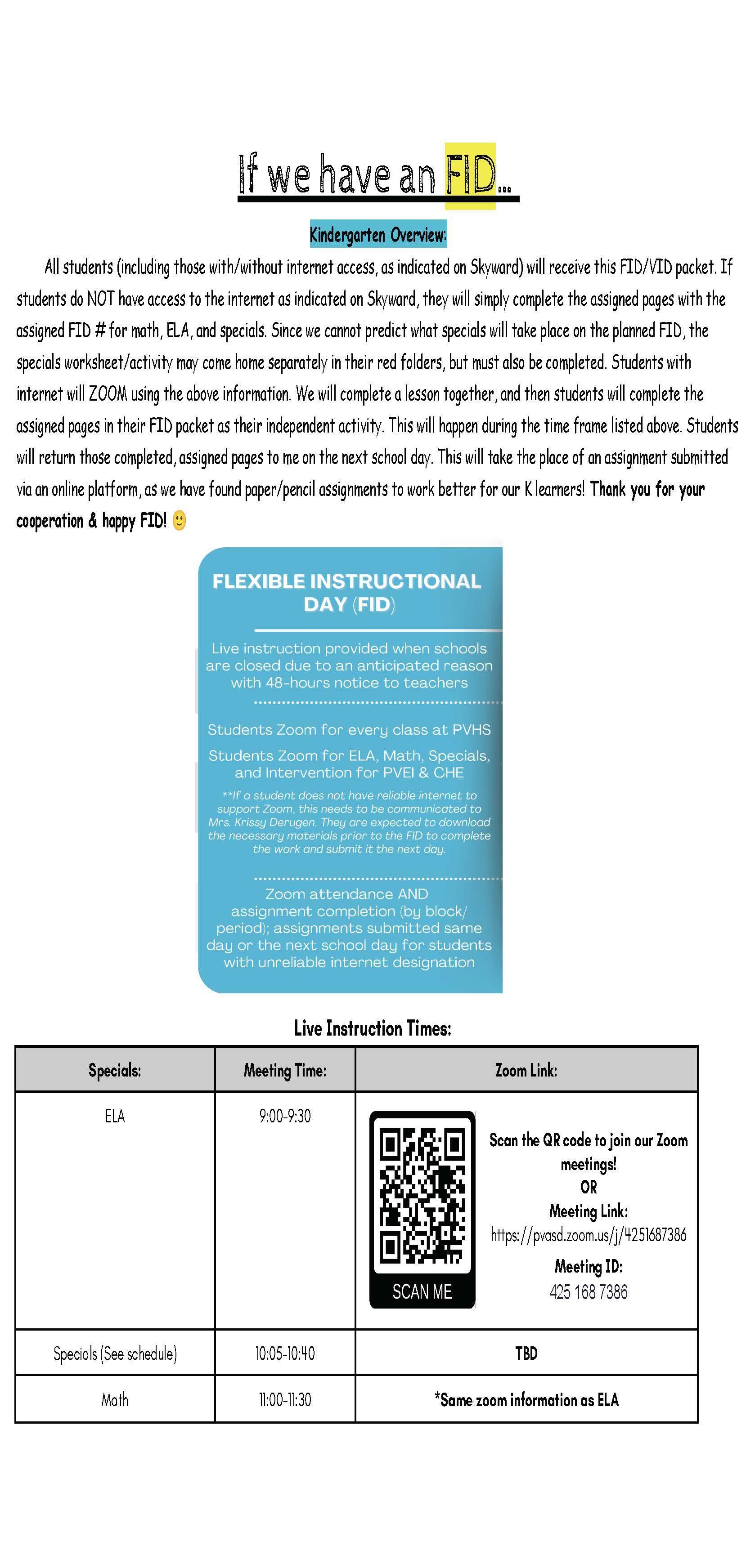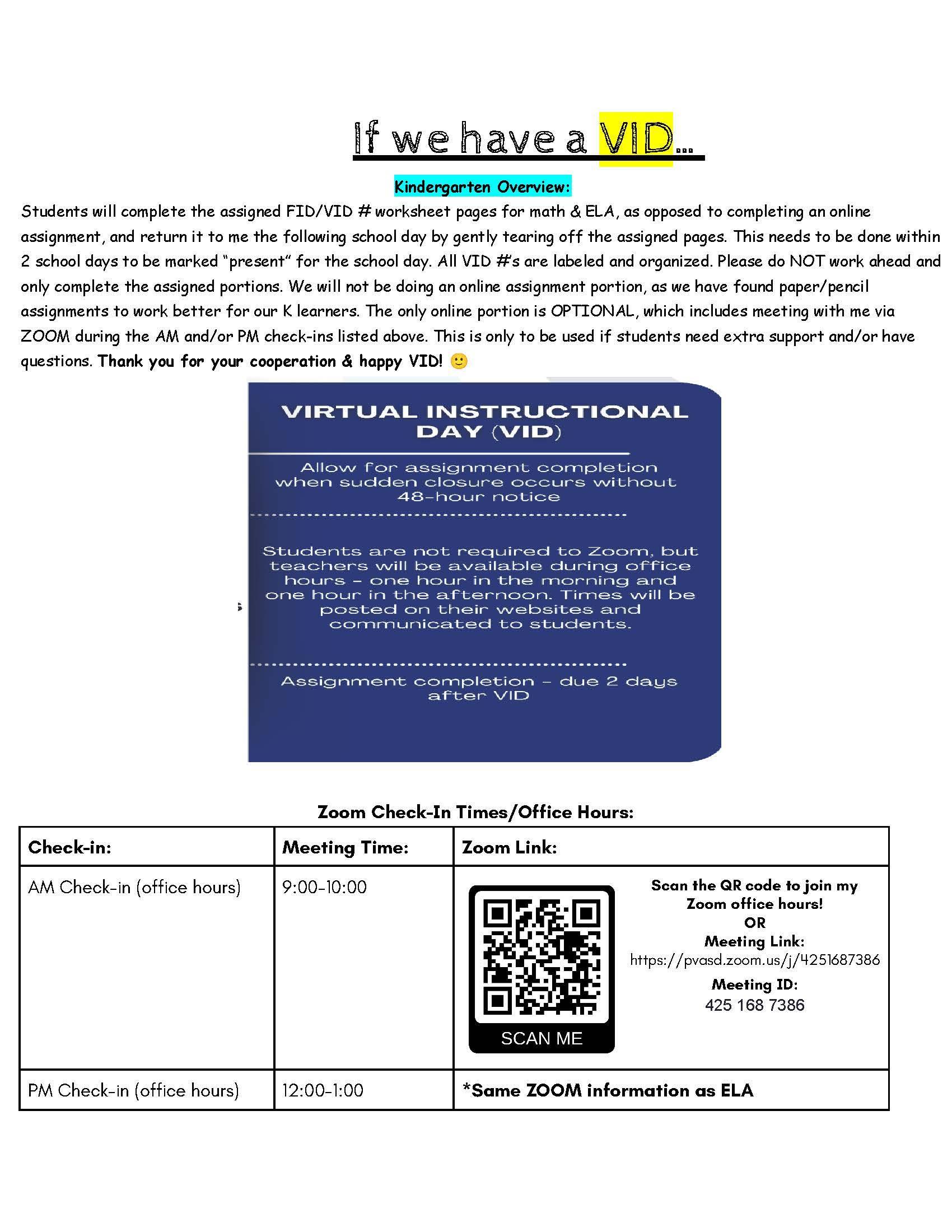 If an VID is called, your kindergarten student will simply complete the paper and pencil work sent home in the FID/VID packet. Mrs.Houtz will be available on zoom for office hours, if you have any questions or concerns on a VID.